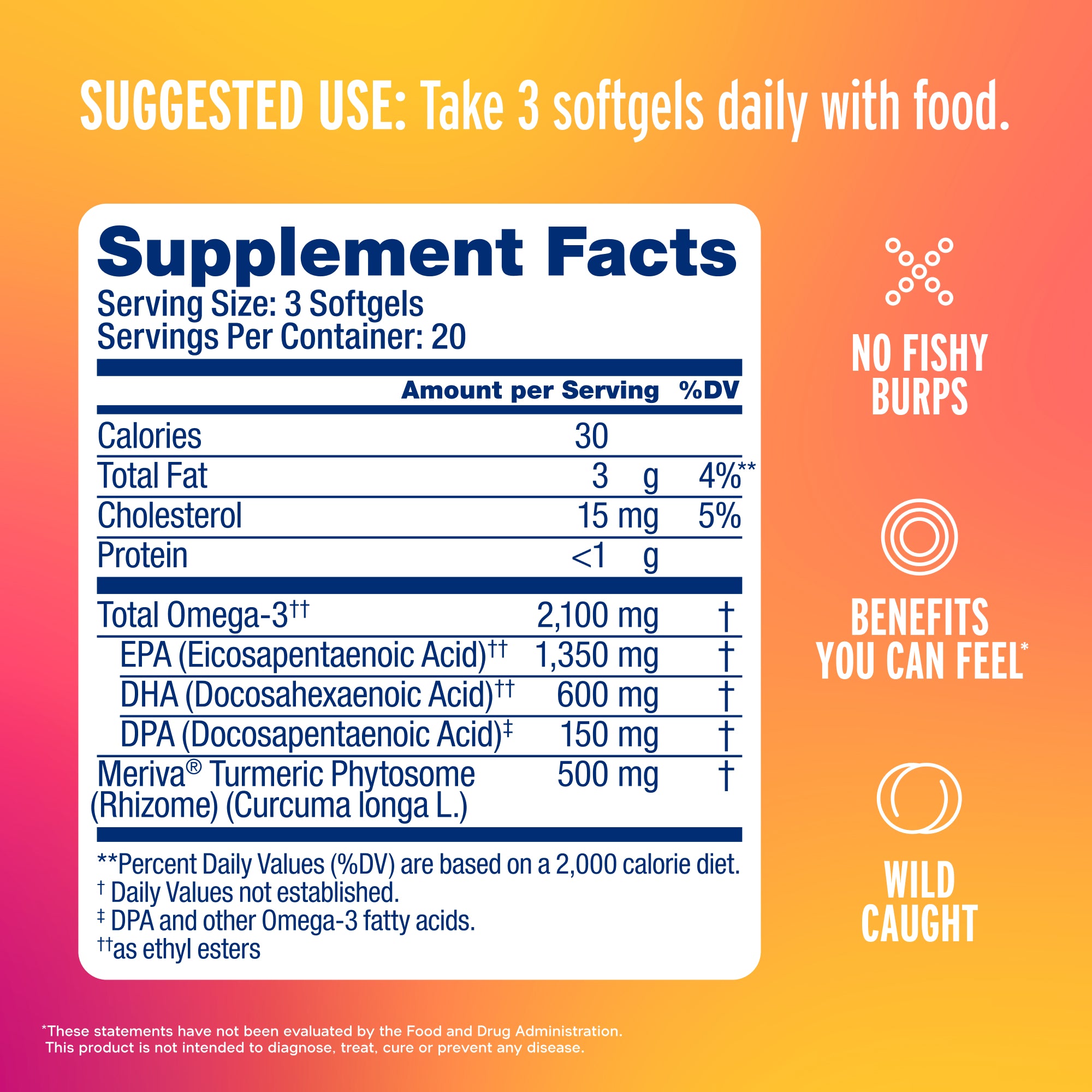 Take three softgels daily, with a meal.